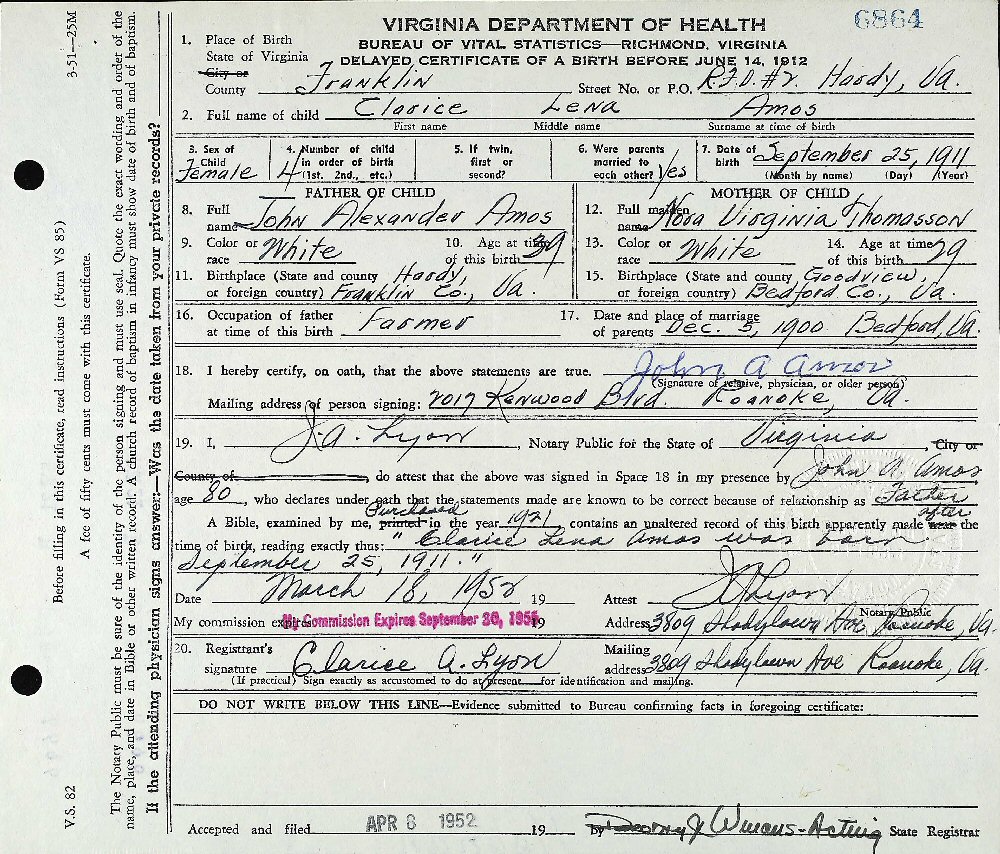 Notes for CLARICE LENA AMOS LYON: