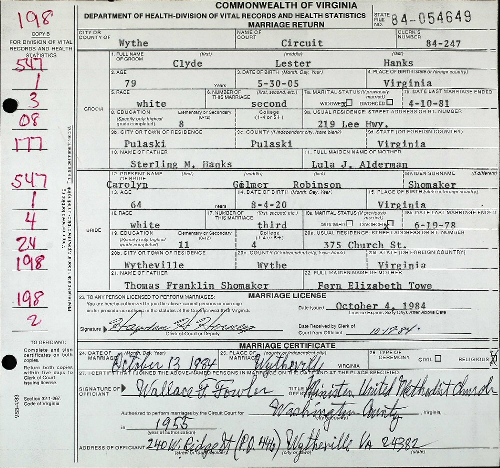 (2) Carolyn Gilmer (nee Shomaker) Robinson October 13, 1984 in Wytheville, Wythe County, Virginia.