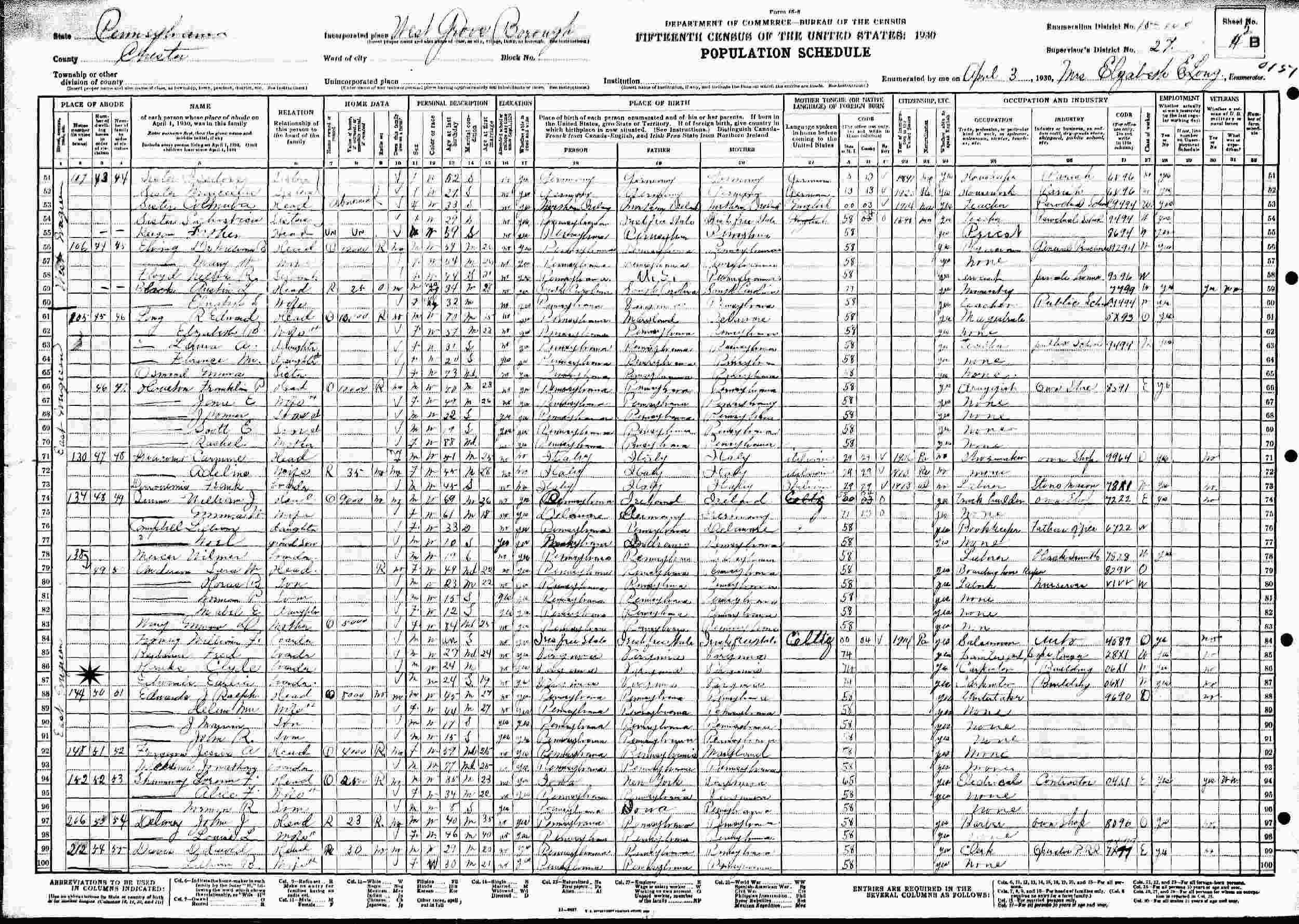 April 3, 1930 - 144 East Evergreen, Supervisor's District 27, Enumeration District 15-1??, East Grove Borough, Chester County, Pennsylvania (Boarder. There with Early Emmett Edwards).