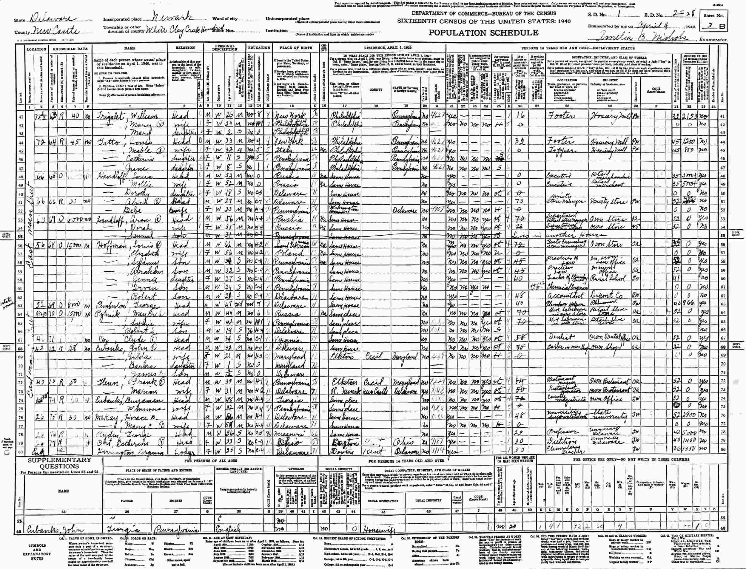 April 4, 1940 - 46 East Main Street, Supervisor's District 1, Enumeration District 2-28, White Clay Creek Hundred, Newark, New Castle County, Delaware.