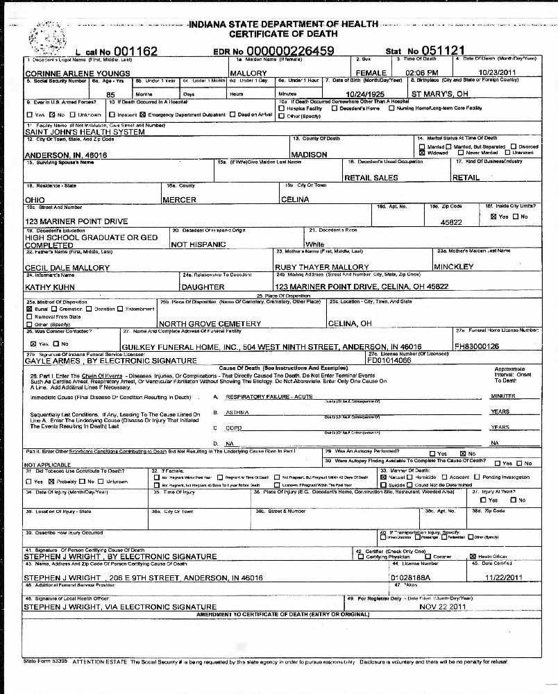 Died: October 23, 2011 in Saint John's Heath System, Anderson, Madison County, Indiana.