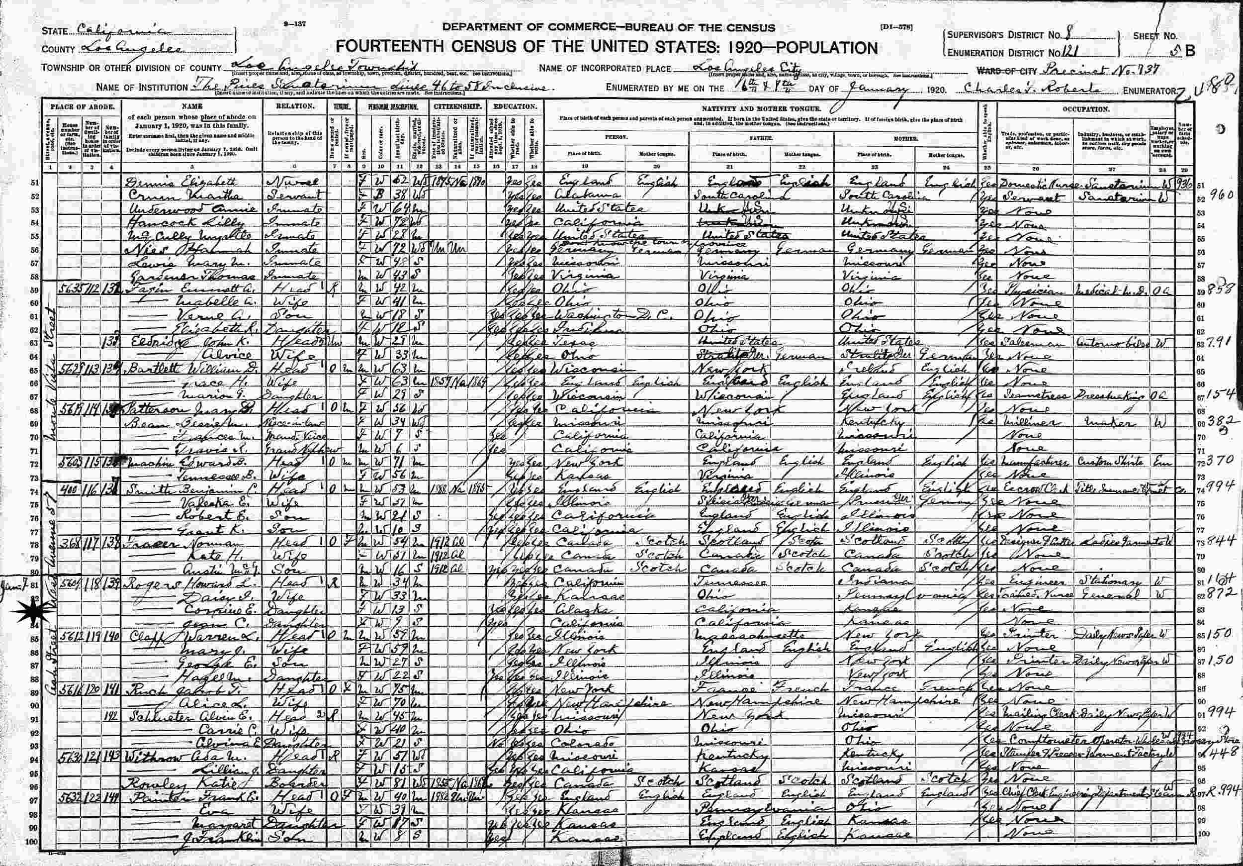 January 6-8, 1920 - 5609 Ash Street West, Assembly District 61, Precinct 737, Supervisor's District 8, Enumeration District 121, Los Angeles, Los Angeles County, California.