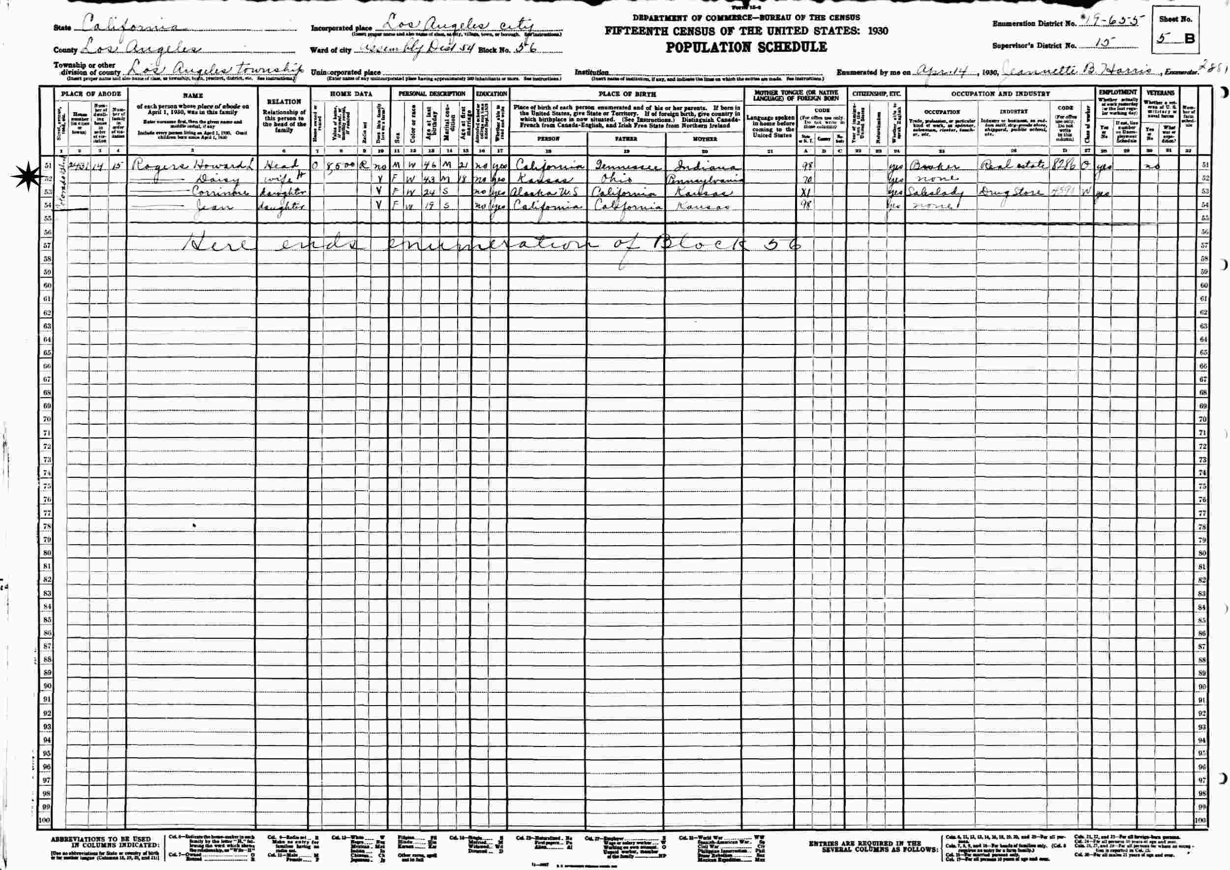 April 14, 1930 - 2431 Colorado Blvd, Assembly District 54, Block 56, Supervisor's District 15, Enumeration District 19-655, Los Angeles, Los Angeles County, California.