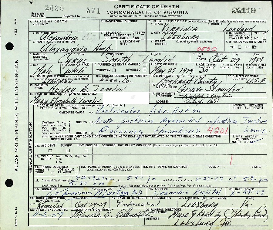 Died: October 29, 1959 in Alexandria, Virginia.