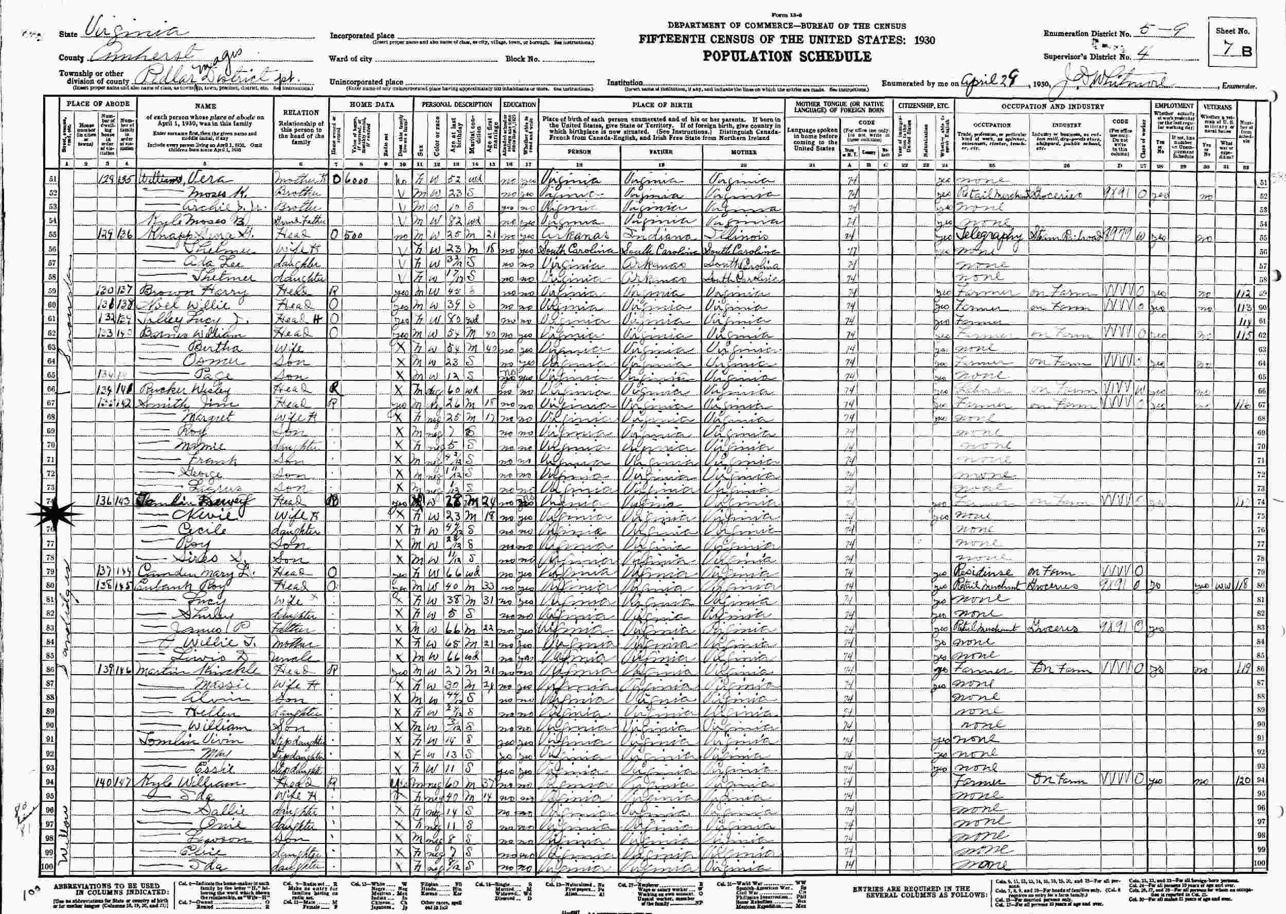 April 29, 1930 - Supervisor's District 4, Enumeration District 5-9, Pedlar Magisterial District, Amherst County, Virginia.