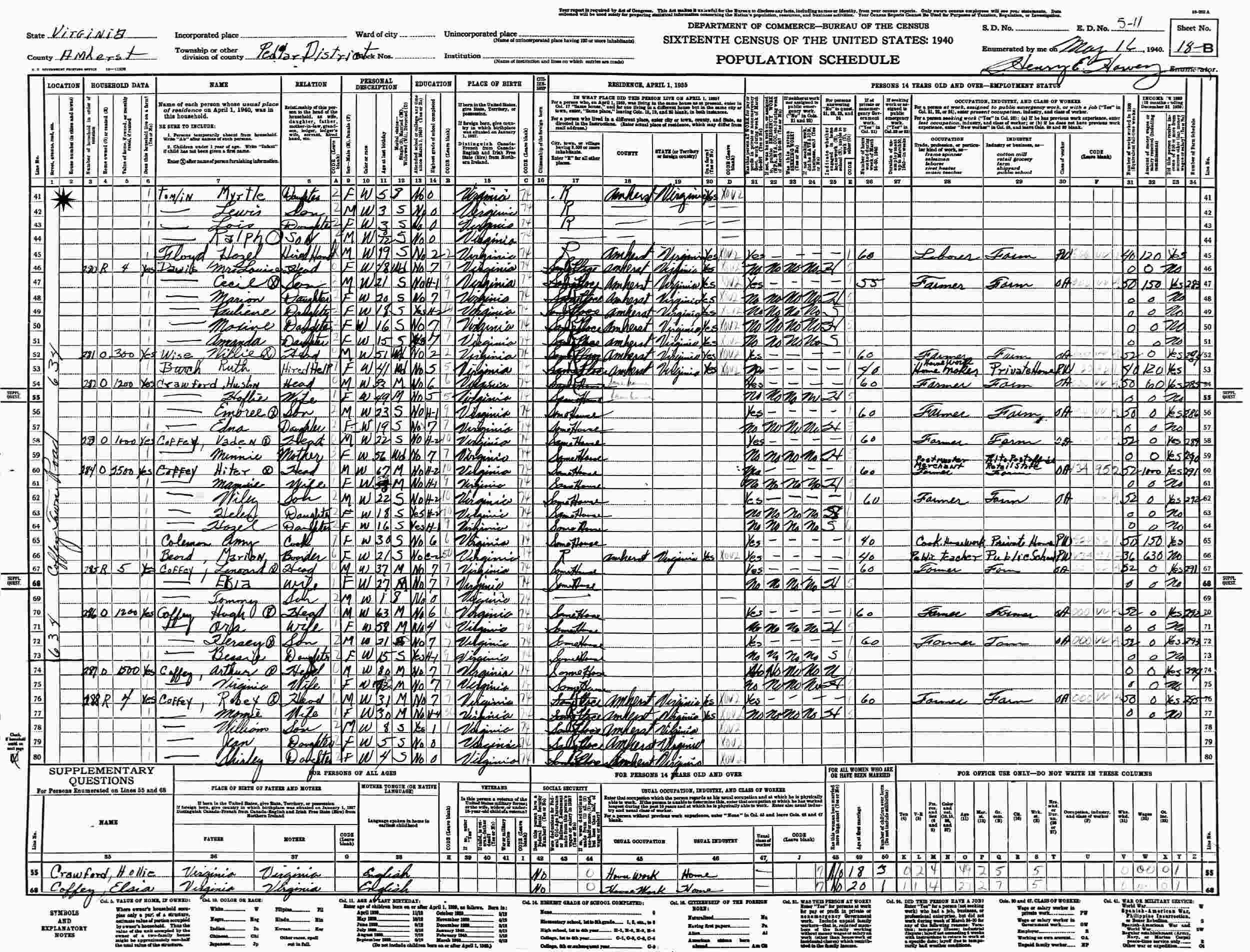 May 16, 1940 - Supervisor's District 7, Enumeration District 5-11, Pedlar Magisterial District, Amherst County, Virginia