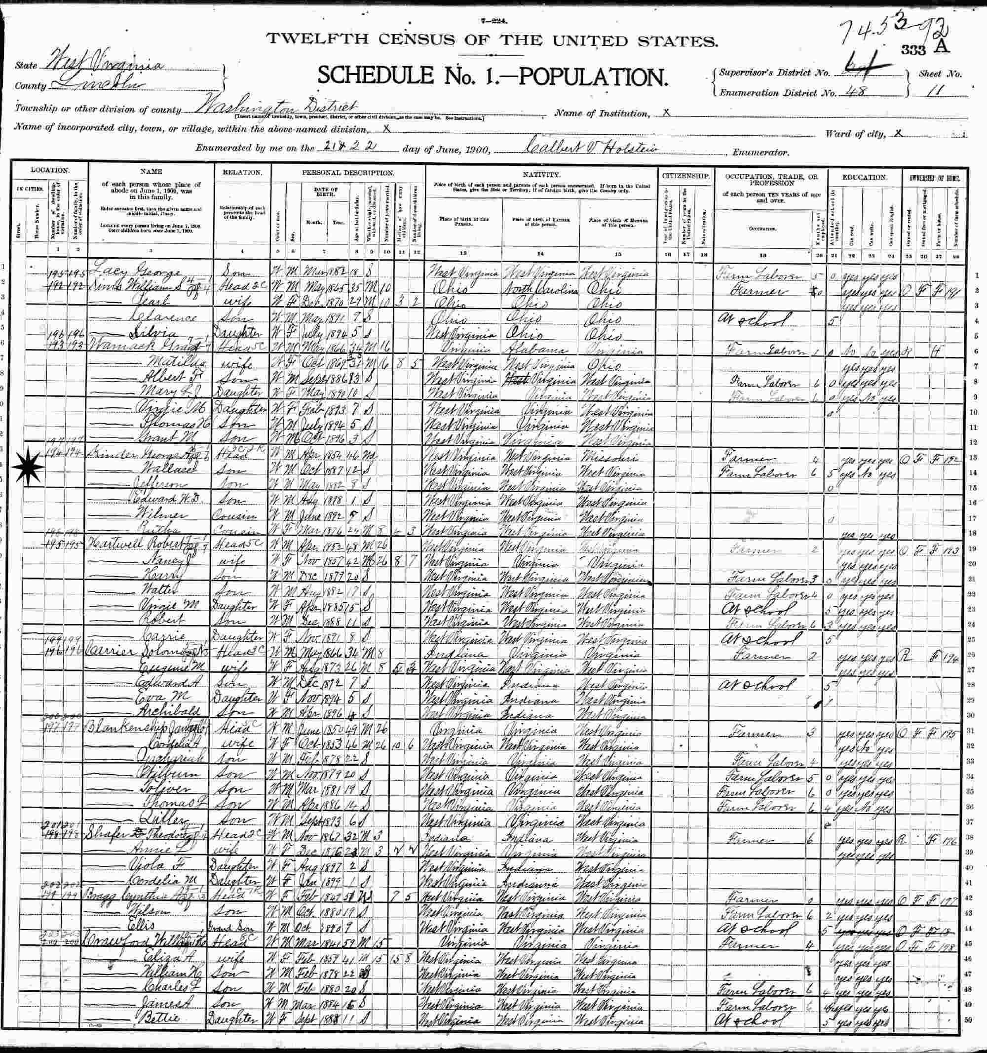 June 21-22, 1900 - Supervisor's District 281, Enumeration District 48, Washington District, Lincoln County, West Virginia.
