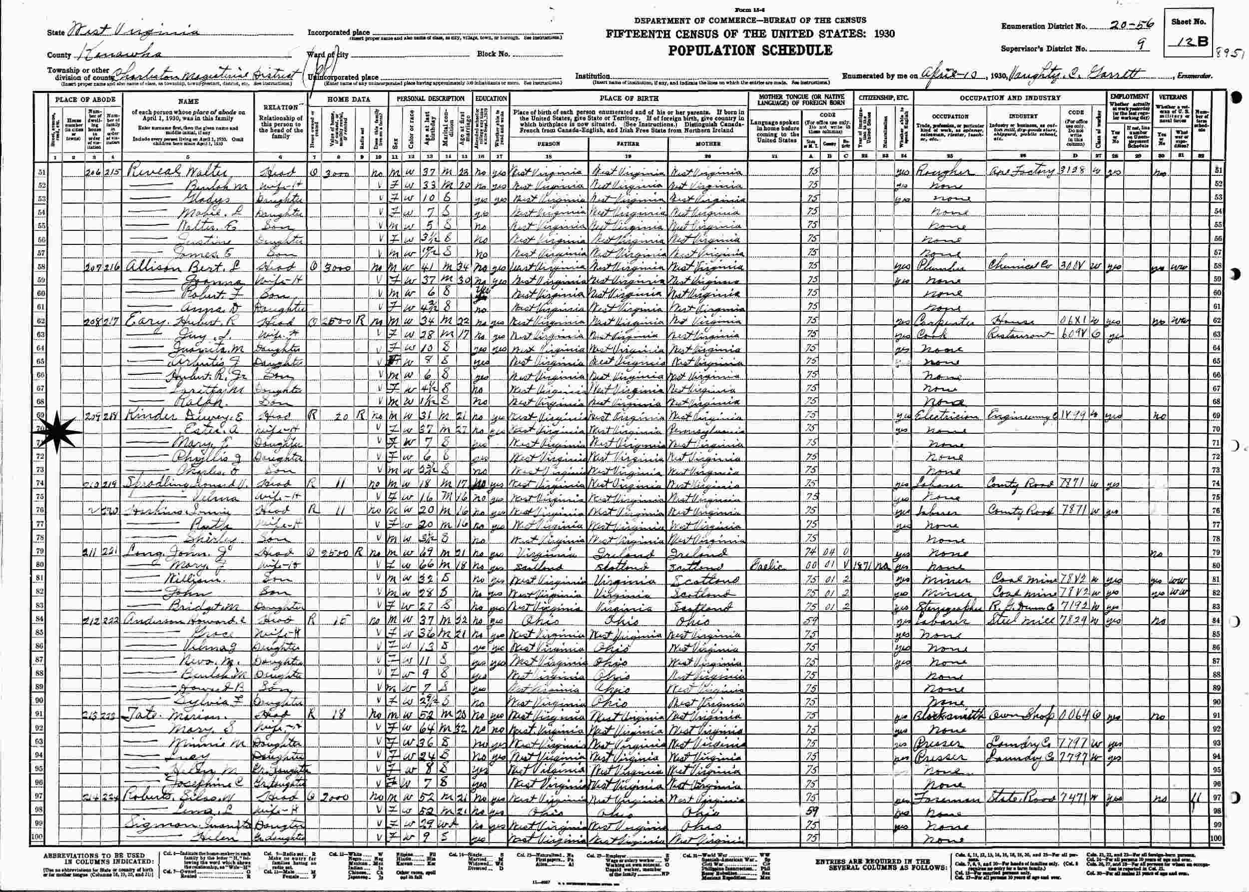 April 10, 1930 - Supervisor's District 9, Enumeration District 20-56, Charleston Magisterial District, Kanawha County, West Virginia.