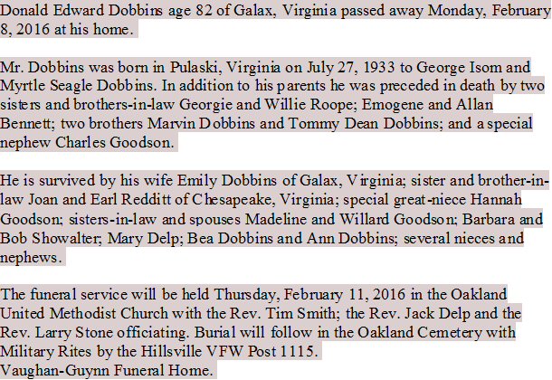 Notes for DONALD EDWARD DOBBINS:
