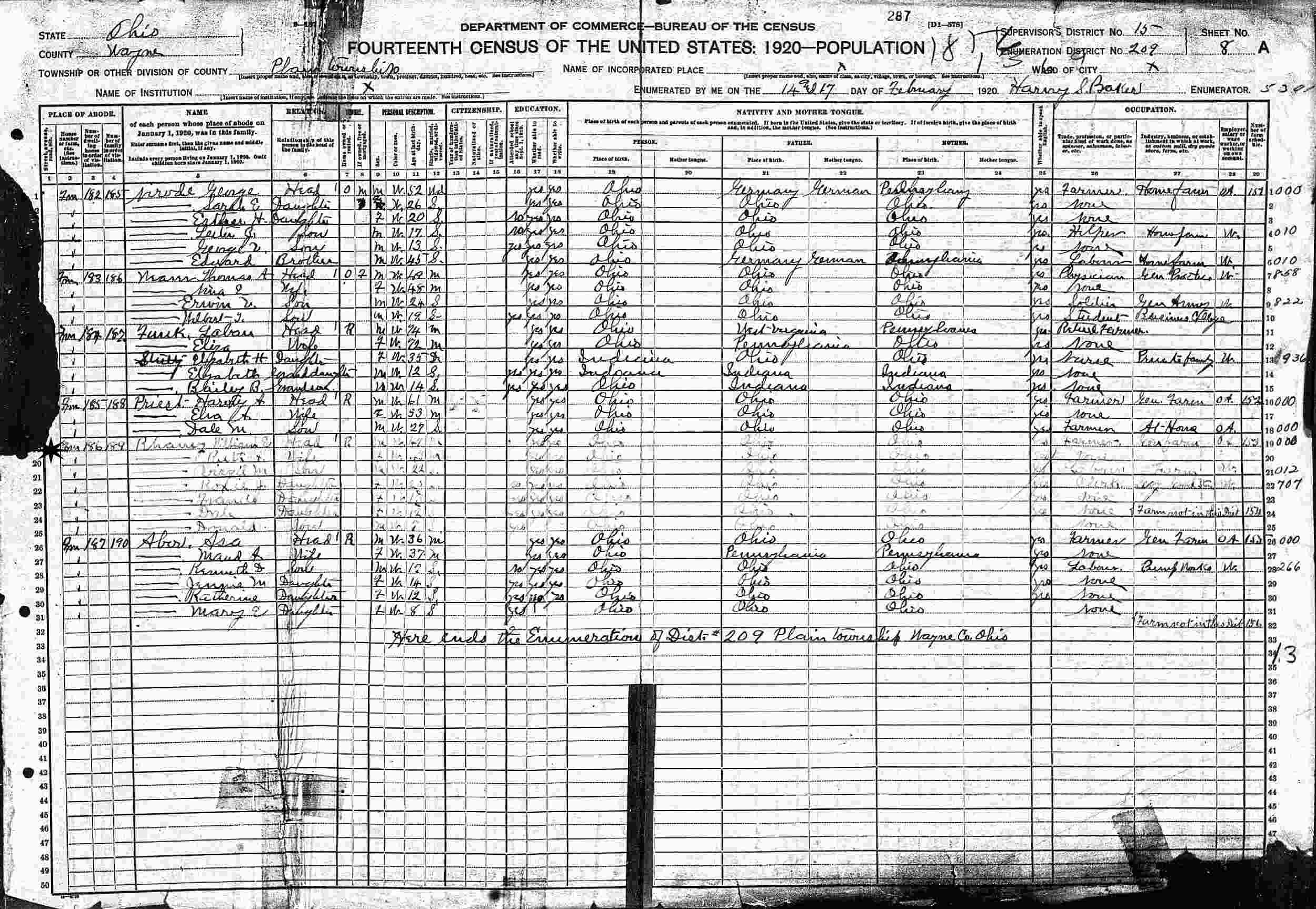 February 14-17, 1920 - Supervisor's District 15, Enumeration District 209, Plain Township, Wayne County, Ohio.