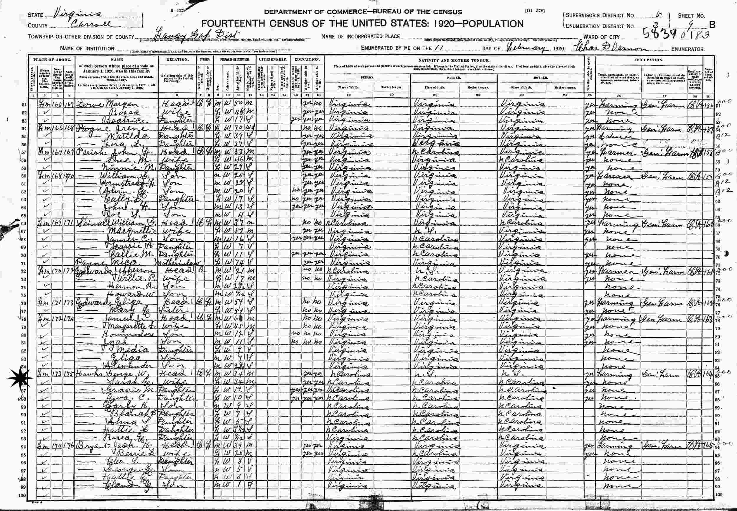 February 11, 1920 - Fancy Gap District, Supervisor's District 5, Enumeration District 3, Carroll County, Virginia.