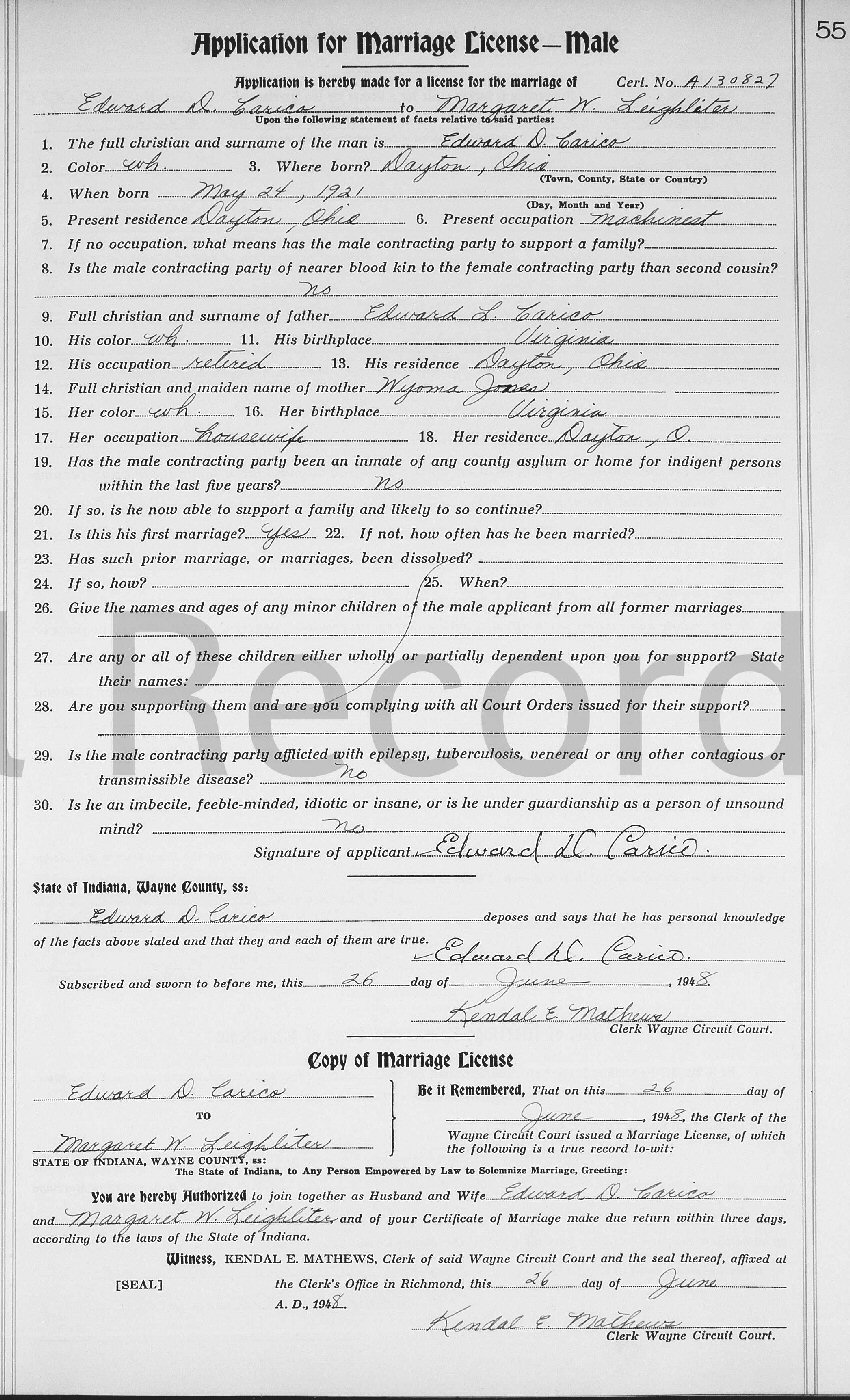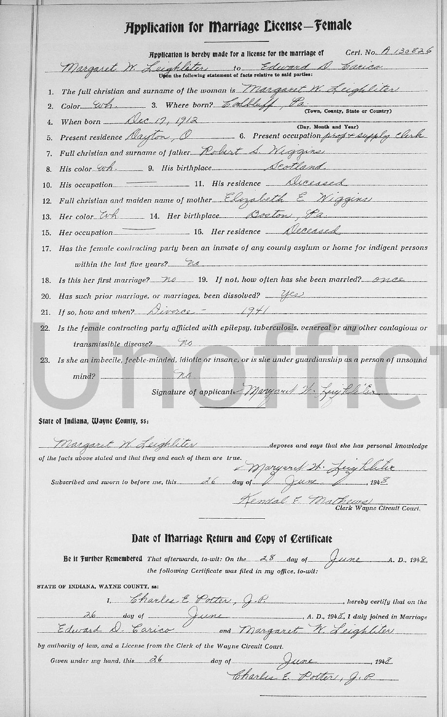 Married: Margaret W (nee Wiggins) Leighliter June 26, 1948 in Wayne County, Indiana. (Divorce: February, 1957 in Mobile, Mobile County, Alabama.)