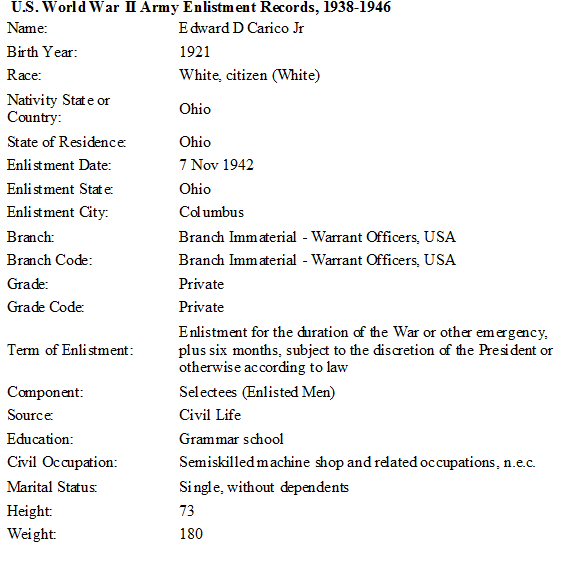 Military Service: November 21, 1942 - WWII - Private, U.S. Army.