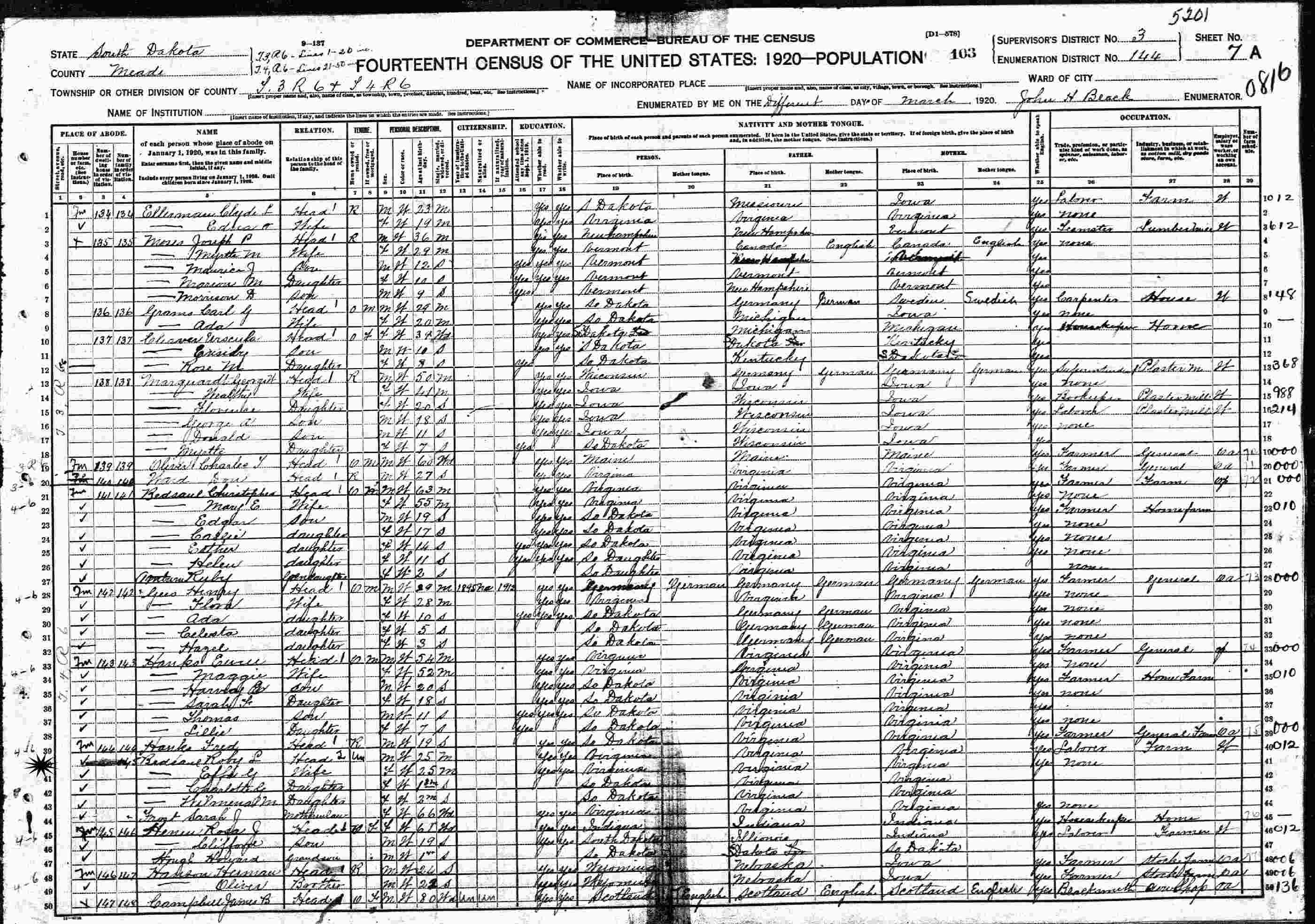 March, 1920 - Township 3, Supervisor's District 3, Enumeration District 144, Meade County, South Dakota.