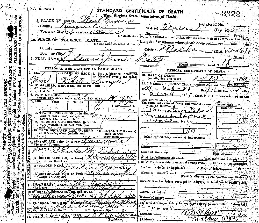 Died: February 25, 1939 in Snow Hill, Malden District, Kanawha County, West Virginia.