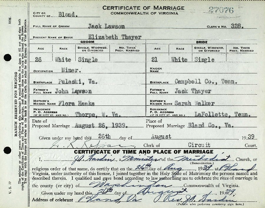 Married: (1) Dorsie "Jack" William Lawson August 26, 1939 in Bland County, Virginia.