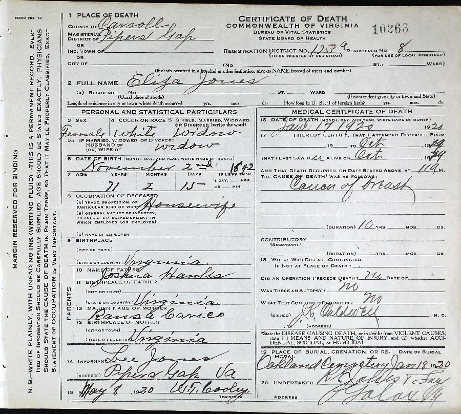 Buried: January 18, 1920 in Oakland United Methodist Church Cemetery, Carroll County, Virginia.