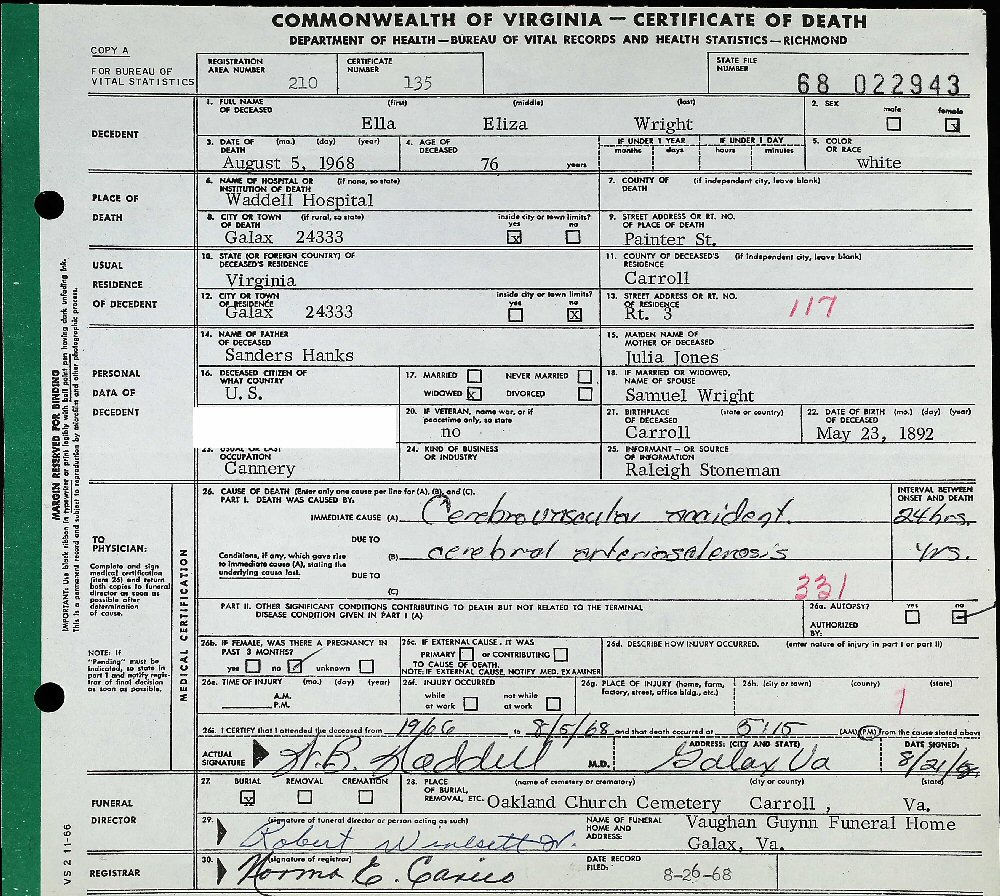 Died: August 5, 1968 in Galax, Grayson County, Virginia.