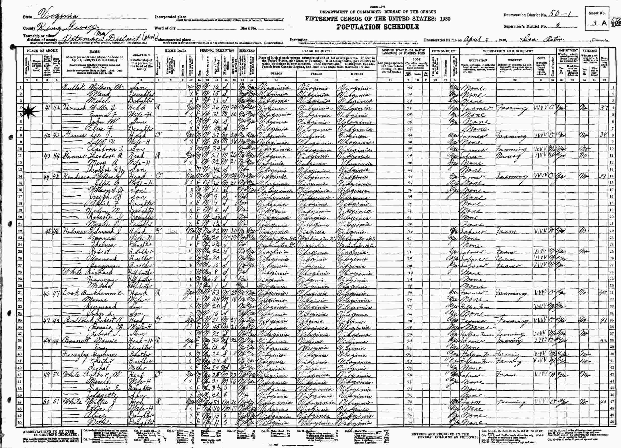 April 4, 1930 - Supervisor's District 2, Enumeration District 50-1, Potomac Magisterial District, King George County, Virginia.