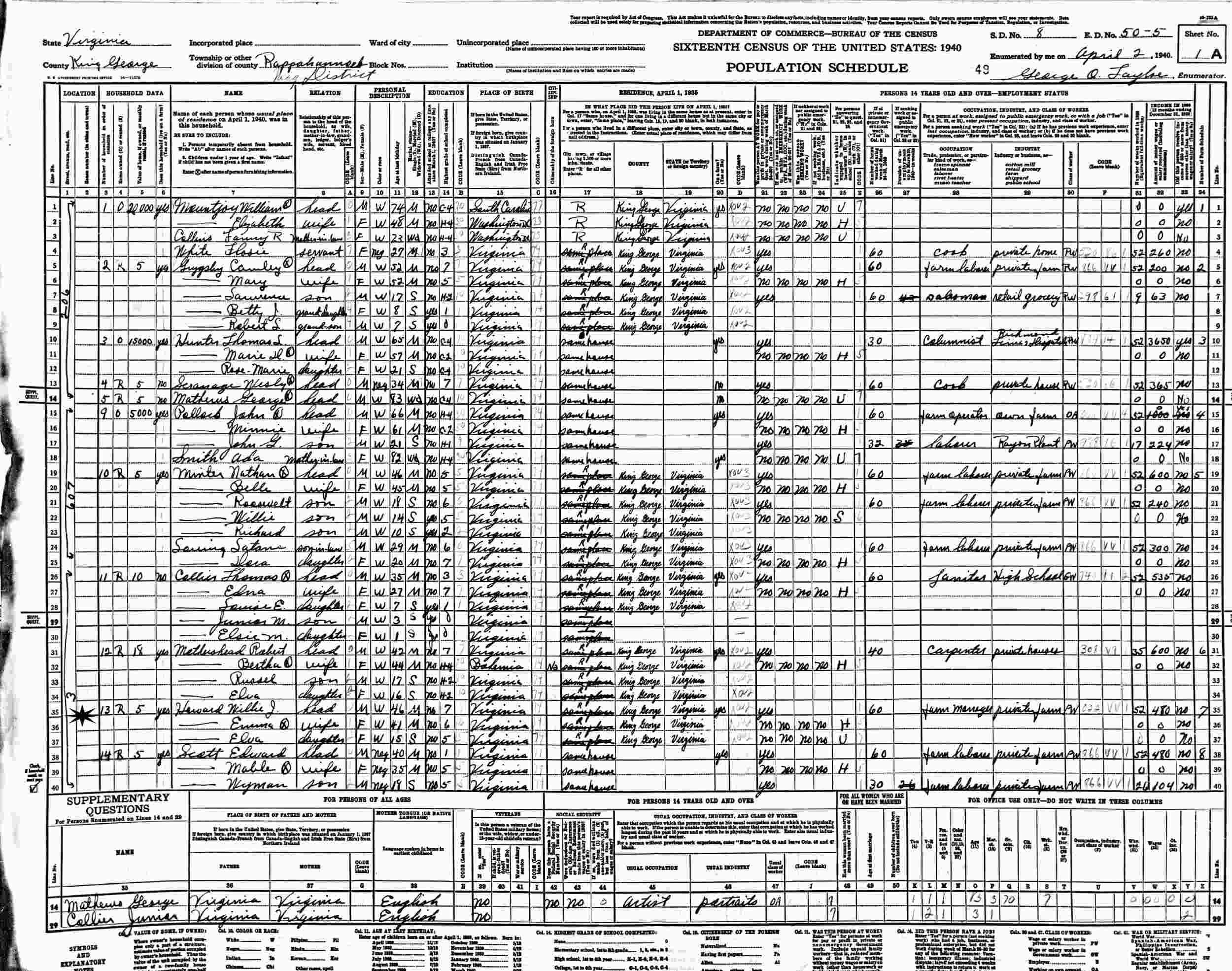 April 2, 1940 - Supervisor's District 8, Enumeration District 50-5, Rappahannock Magisterial District, King George County, Virginia.