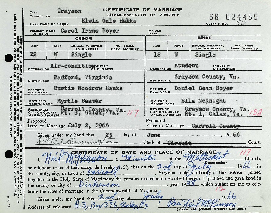 Married: (1) Carol Irene Boyer July 2, 1966 in Carroll County, Virginia.(Separation: February 1, 1977; Divorce: September 18, 1978.)