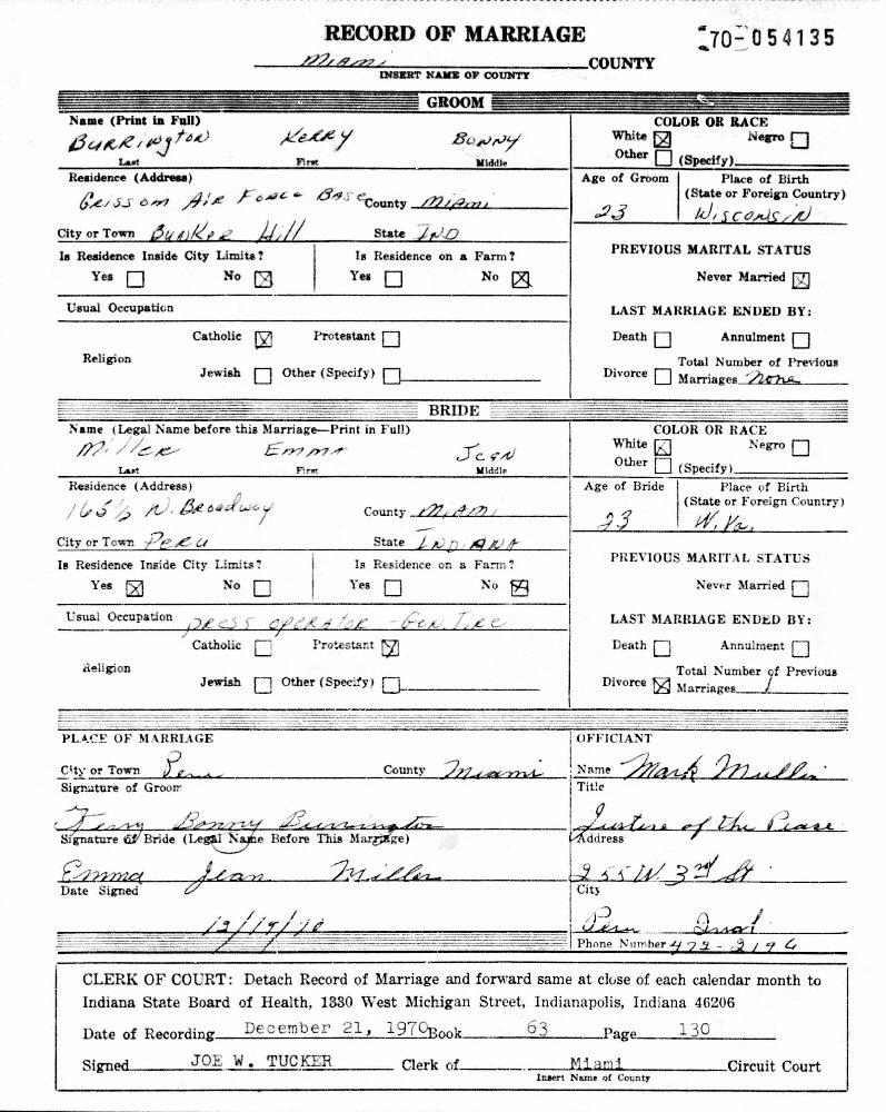 (2) Kerry Bonny Burrington, Sr. December 19, 1970 in Penn, Miami County, Indiana (Divorce: Before 1978.)