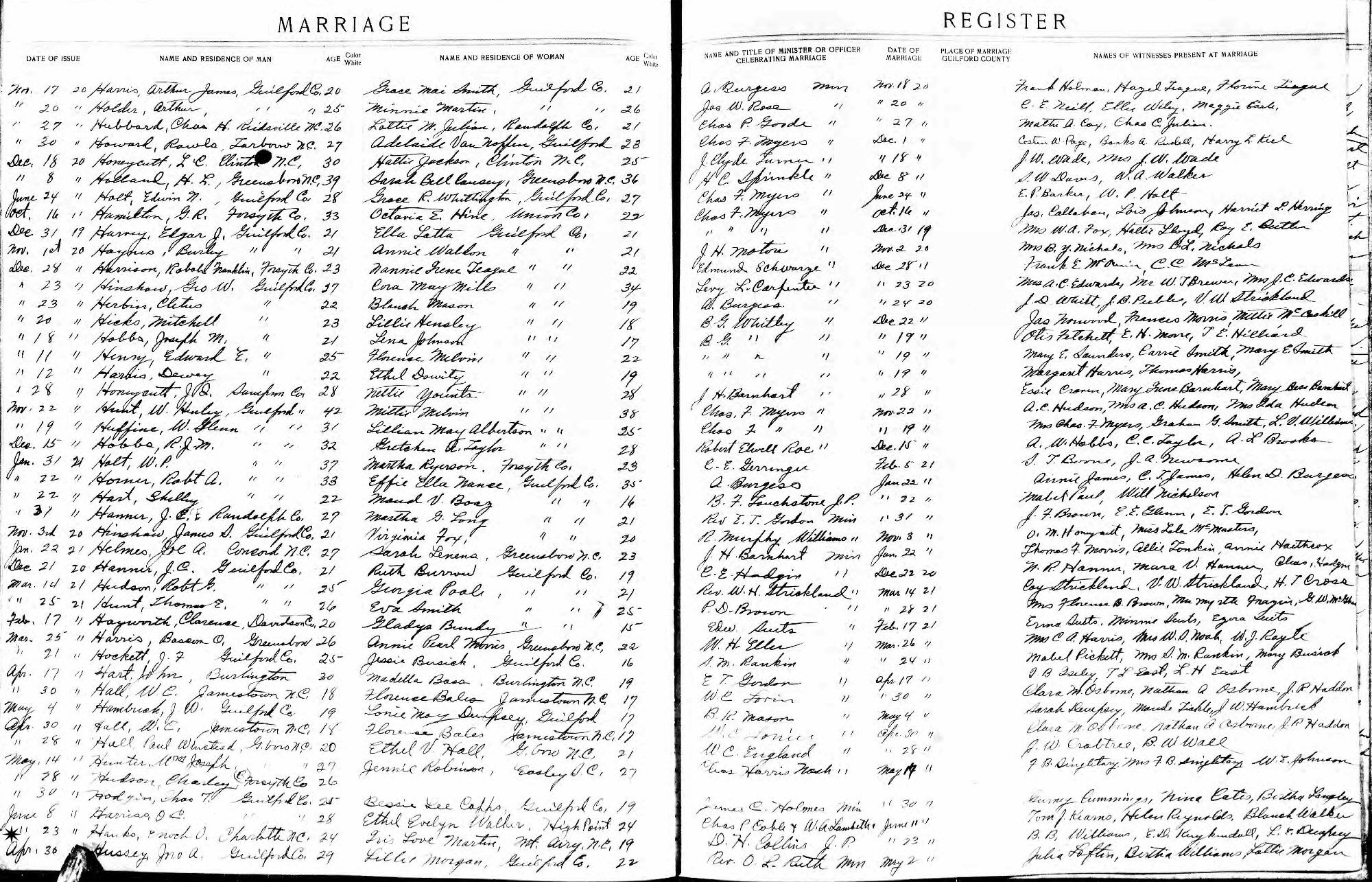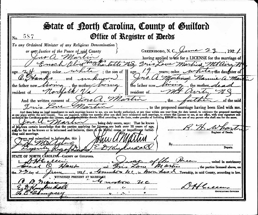 Married: Iris Love Martin June 23, 1921 in Morehead, Guilford County, North Carolina.