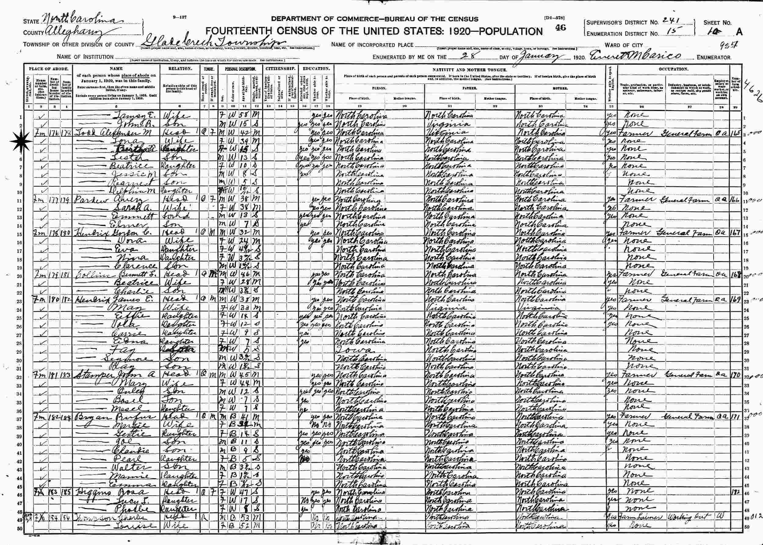Janary 28, 1920 - Supervisor's District 241, Enumeration District 15, Glade Creek Township, Alleghany County, North Carolina.
