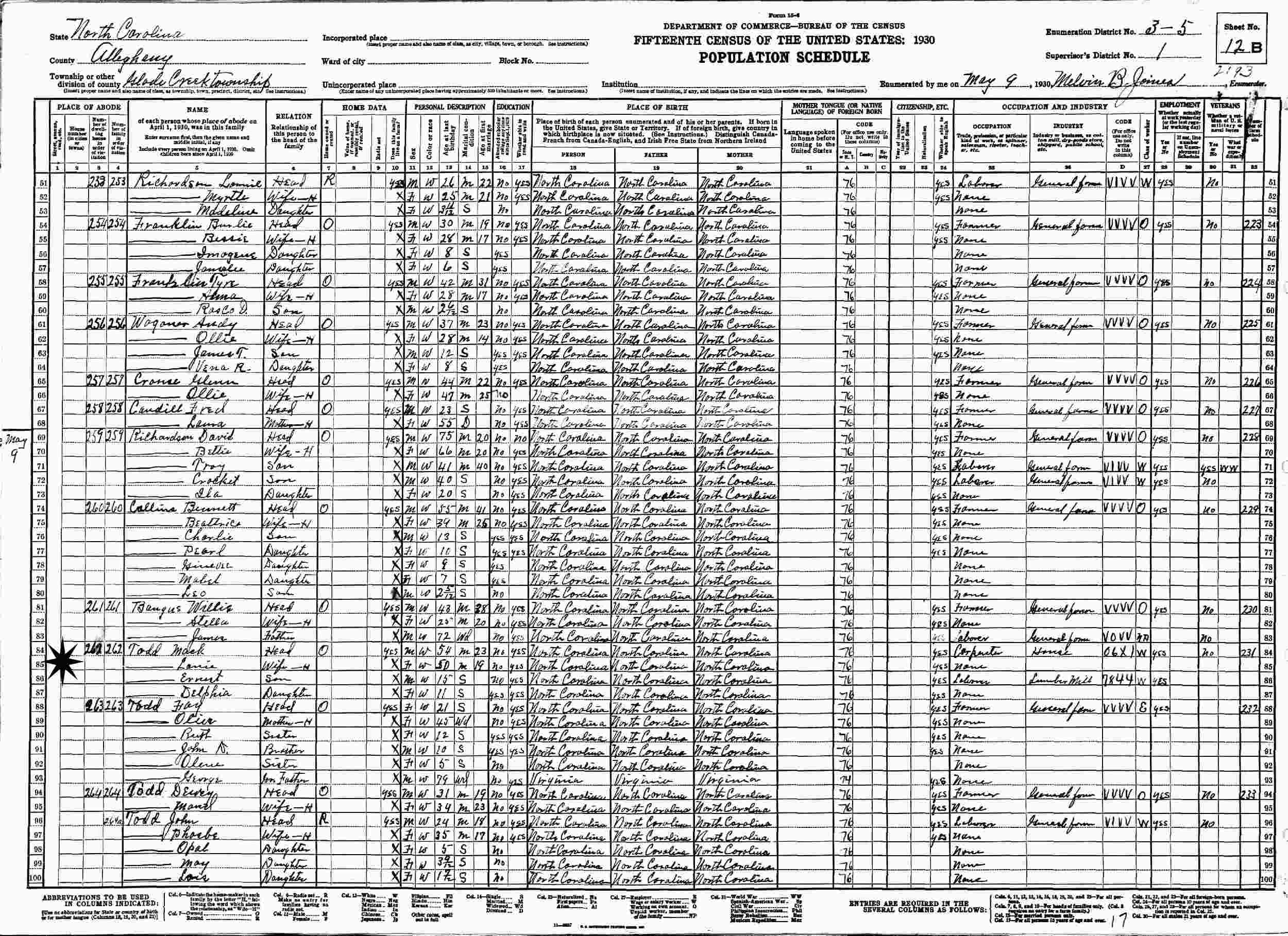 May 9, 1930 - Supervisor's District 1, Enumeration District 3-5, Glade Creek Township, Alleghany County, North Carolina.