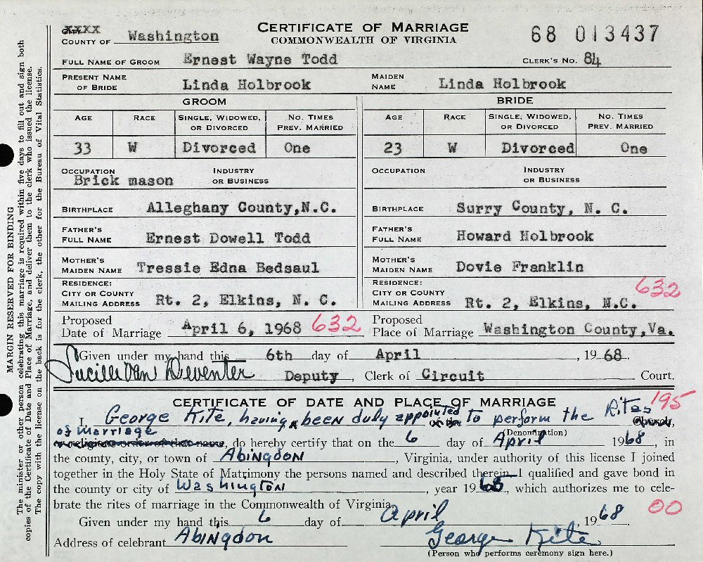 (2) Linda Ruth Holbrook April 6, 1968 in Abingdon, Washington County, Virginia.