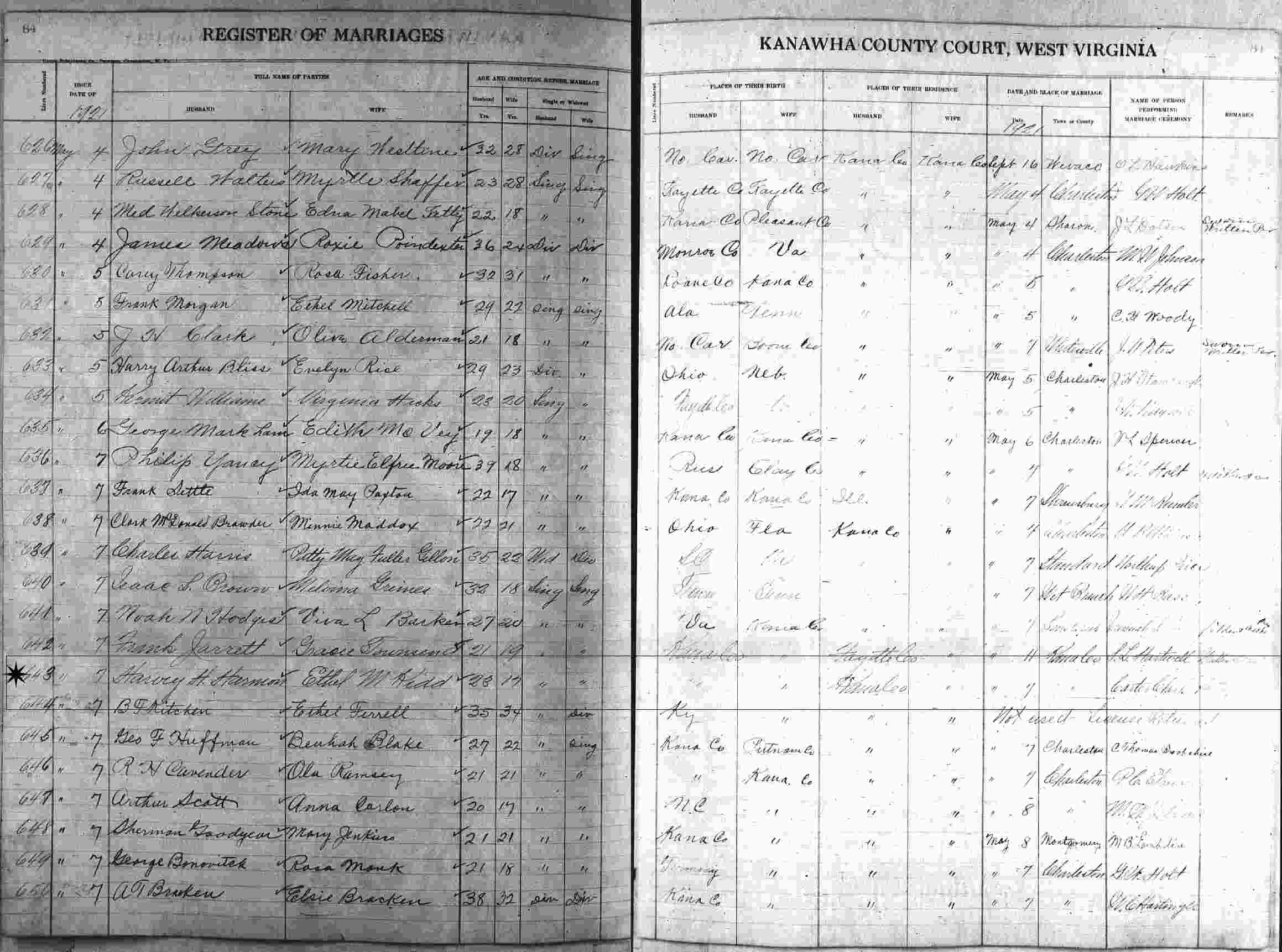 Married: Harvey Scott Harmon May 7, 1921 in Kanawha County, West Virginia.