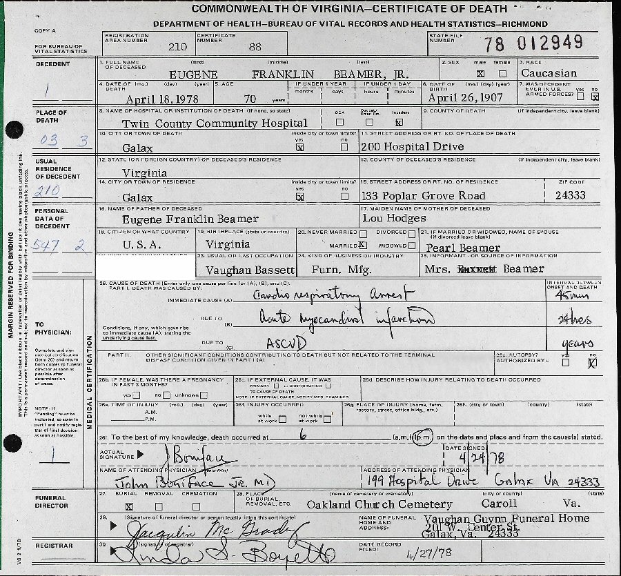 Died: April 18, 1978 in Twin County Community Hospital, Galax, Virginia.