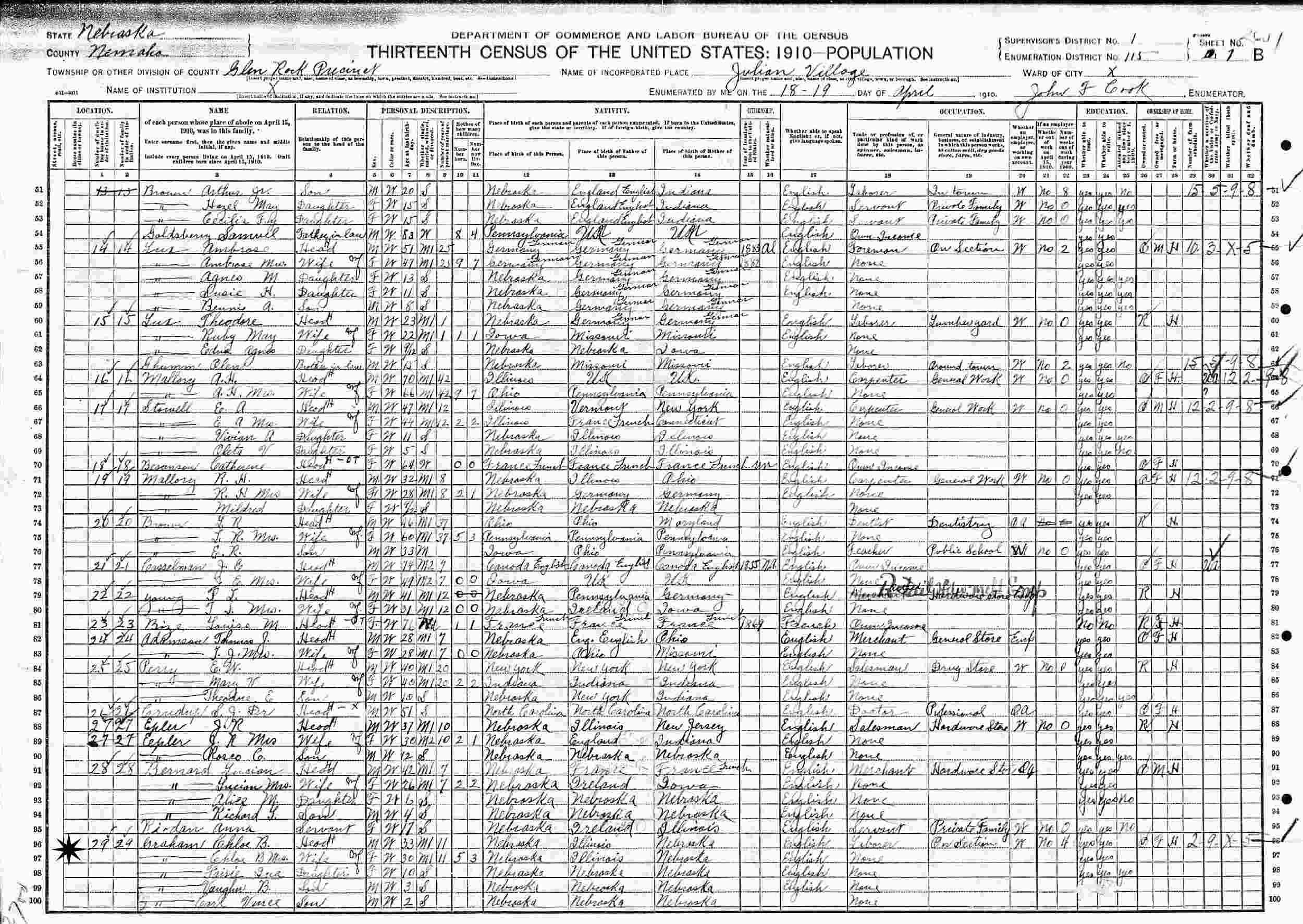 April 18-19, 1910 - Supervisor's District 1, Enumeration District 115, Glenrock Precinct, Julian Village, Nemaha County, Nebraska.