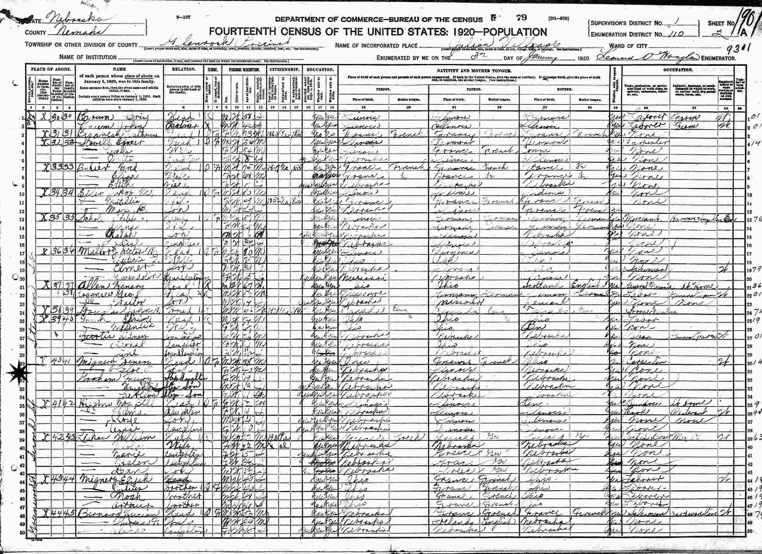 January 3, 1920 - Steveson Street, Supervisor's District 1, Enumeration District 110, Glenbrook Precinct, Julian Village, Nemaha County, Nebraska (w/stepfather and mother).