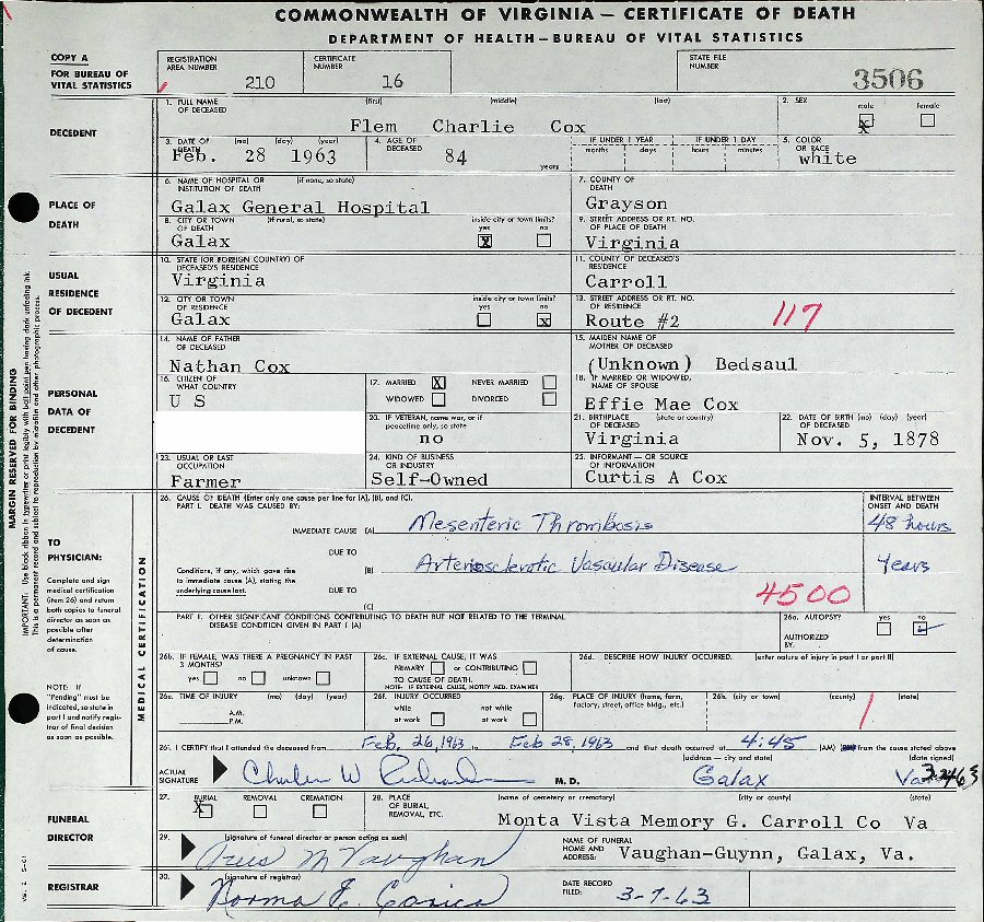 Died: February 28, 1963 in Galax General Hospital, Galax, Grayson County, Virginia.