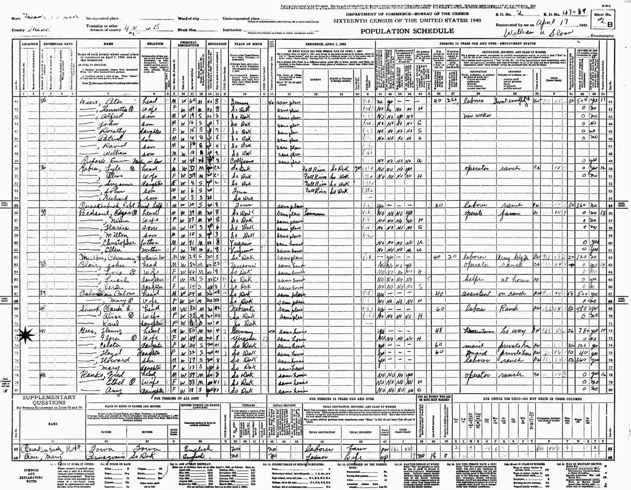 April 17, 1940 - 4N 6E, Supervisor's Districct 2, Enumeration District 47-39, Meade County, South Dakota.