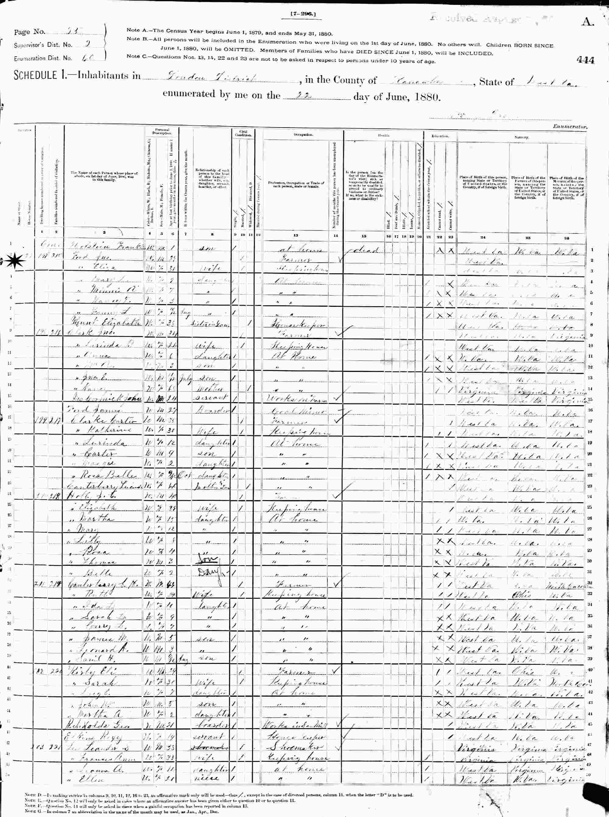 June 22, 1880 - Supervisor's District 2, Enumeration District 60, Loudon District, Kananwha County, West VIrginia.