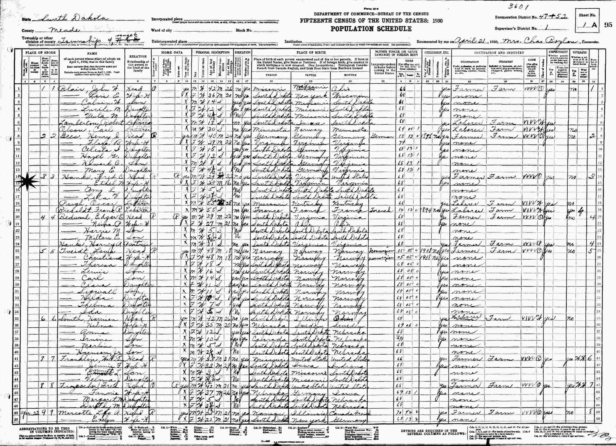 April 21, 1930 - Township 4, Supervisor's District 1, Enumeration District 47-52, Meade County, South Dakota.