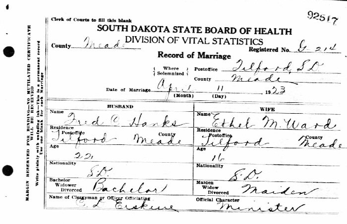 Married: Ethel Molly Ward April 11, 1923 in Meade County, South Dakota (Certificate #92517).