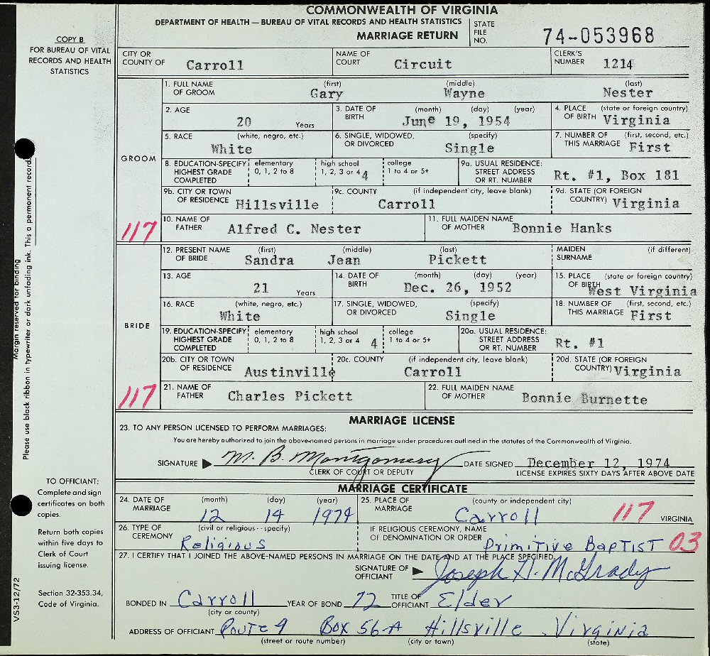Married: Sandra Jean Pickett December 14, 1974 in Carroll County, Virginia.