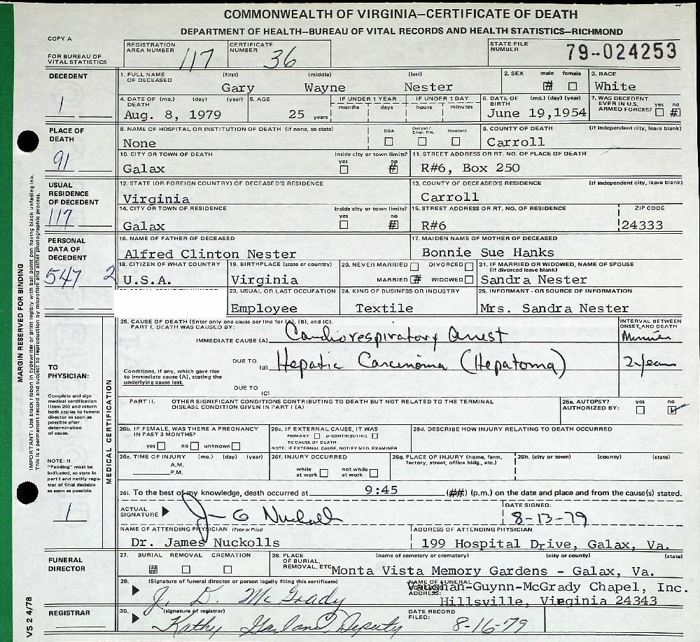 Buried: Monta Vista Memory Gardens Cemetery, Galax, Virginia.