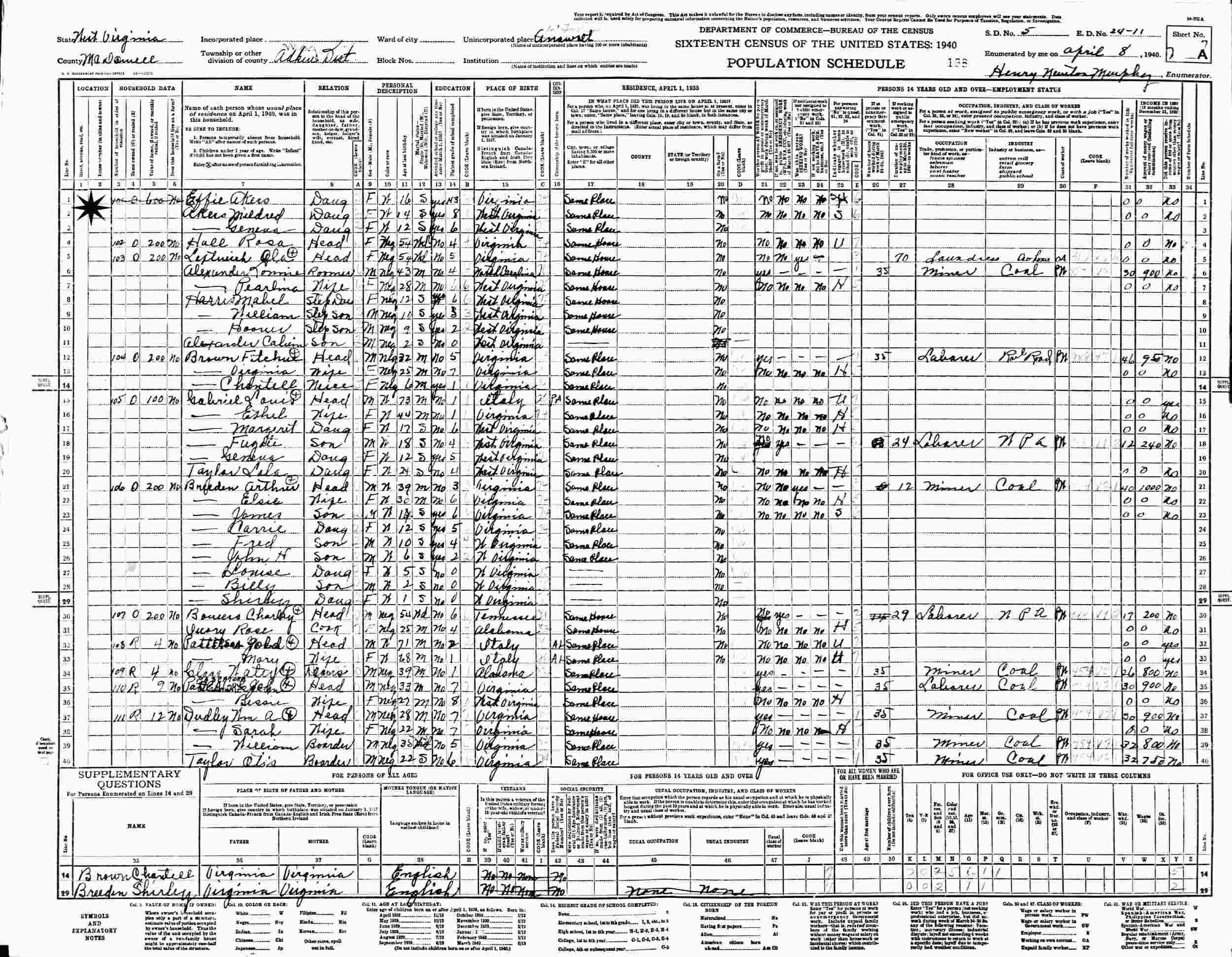 April 8, 1940 - Supervisor's District 5, Enumeration District 24-11, Adkin District, McDowell County, West Virginia.