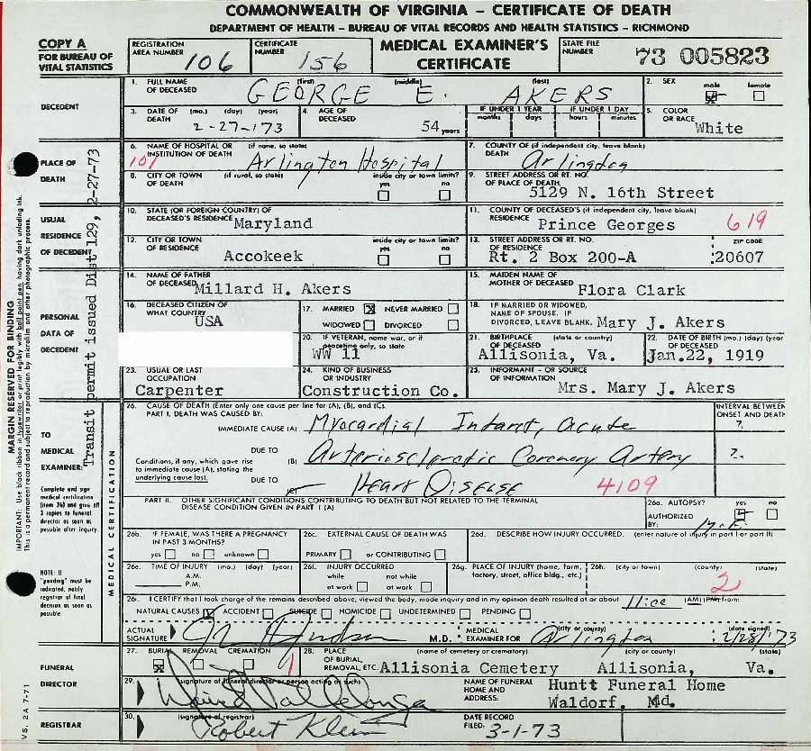 Died: February 27, 1973 in Accokeek, Prince George's County, Maryland.