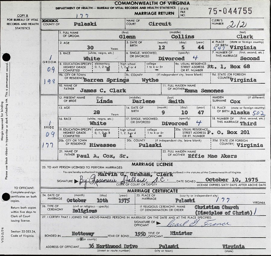 Married: (1) Myrtle Lee York January 25, 1964 in Wytheville, Wythe County, Virginia. (Separation: June 3, 1974. Divorce: June 18, 1975 in Wythe County, Virginia.)