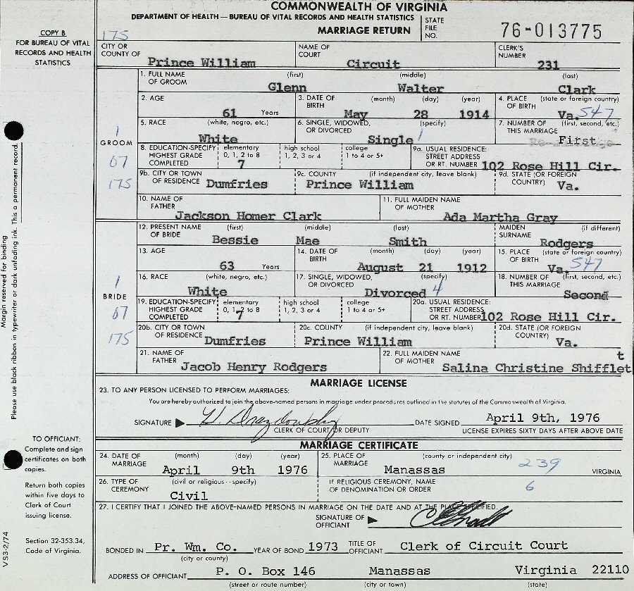 Married: Bessie Mae (nee Rodgers) Smith April 9, 1976 in Dumfries, Prince William, Virginia.