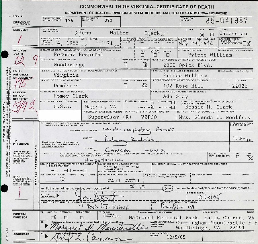Died: December 4, 1985 in Potomac Hospital, Woodbridge, Prince William County, Virginia.