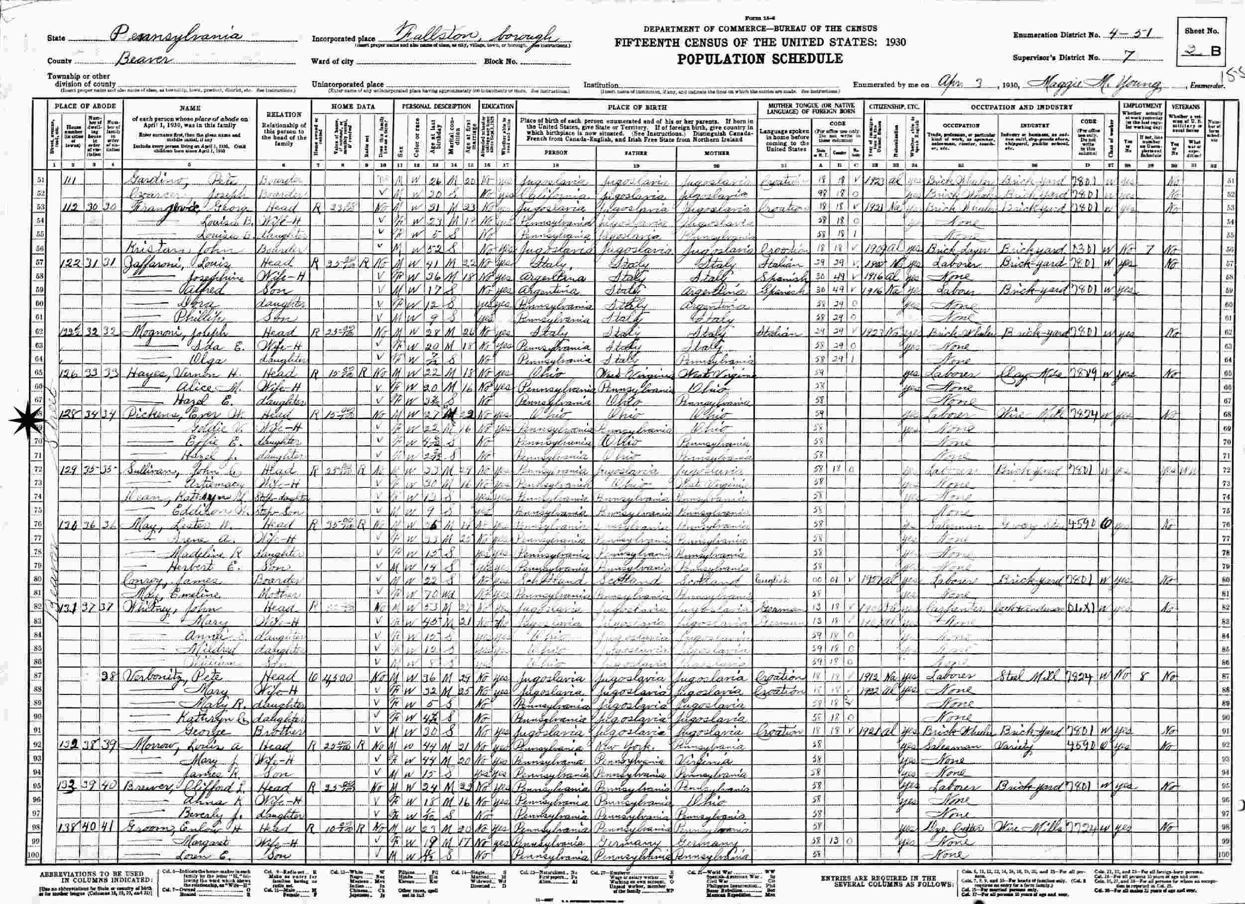 April 3, 1930 - 128 Beaver Street, Supervisor's District 7, Enumeration District 4-51, Fallston Borough, Beaver County, Pennsylvania.