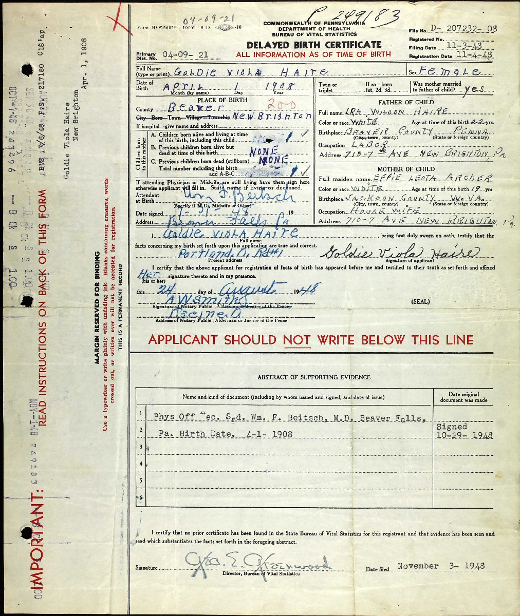 Born: April 1, 1908 in New Brighton, Beaver County, Pennsylvania.