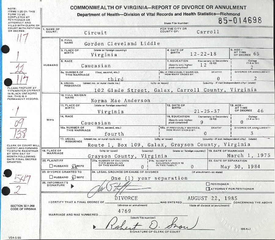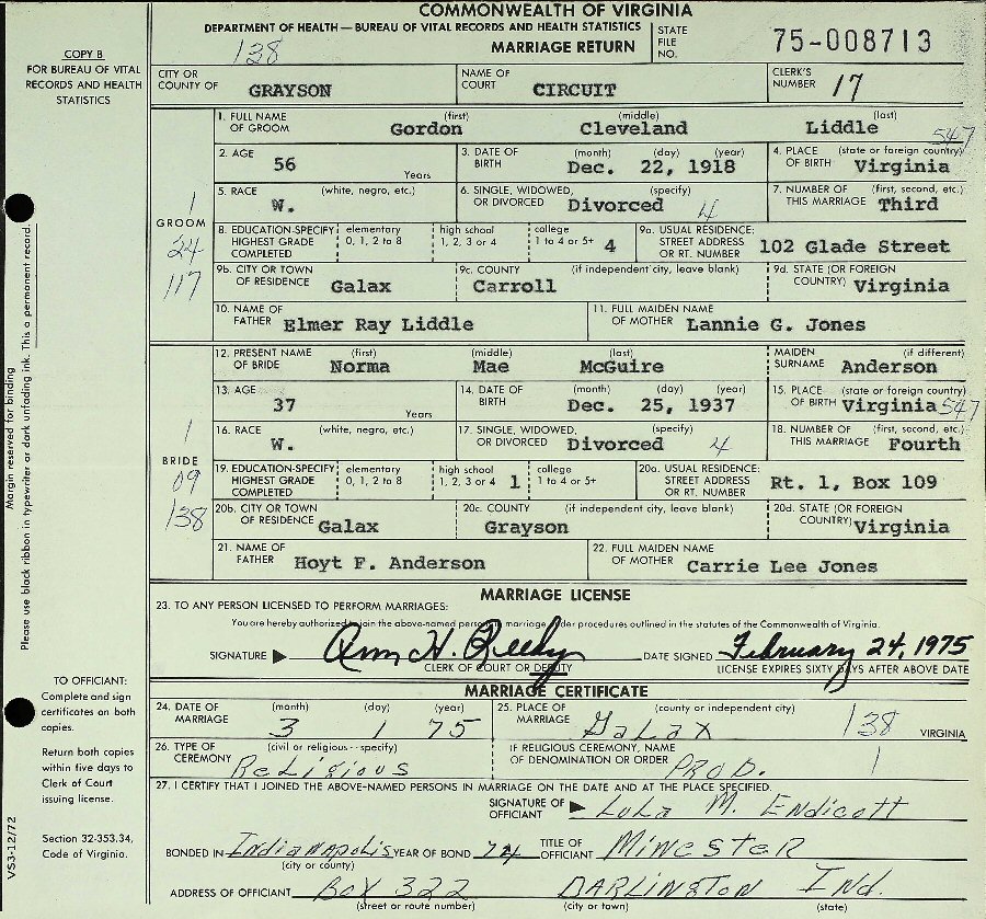 (2) Norma Mae (nee Anderson) McGuire March 1, 1975 in Galax, Virginia. (Separation: May 30, 1984; Divorce: August 22, 1985.)