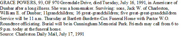 Died: July 16, 1991 in Dunbar, Kanawha County, West Virginia.